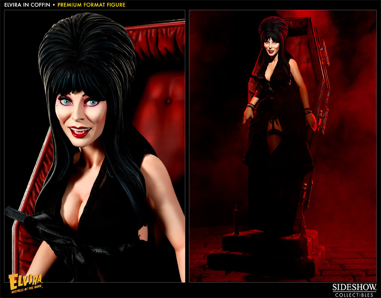 The Exclusive Elvira in Coffin Premium Format Figure will be priced at $349.99 and will include a switch-out hand holding a dagger. Additionally, a regular edition without the extra switch out item will also be priced at $349.99.