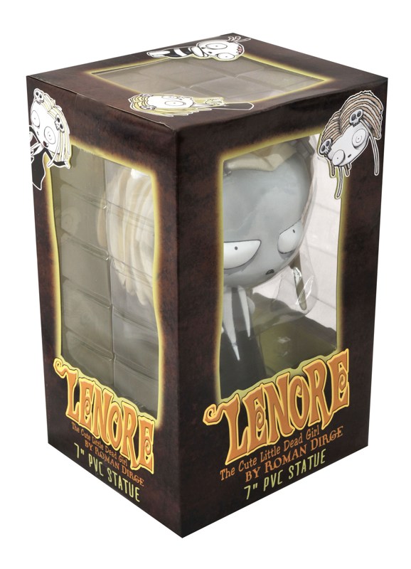 Don't let her cuteness fool you - Lenore is not to be trifled with. Nor is she to be talked down to, lied to, threatened, annoyed, spoken to or looked at. Any one of those things is punishable by Lenore removing your kneecaps. Diamond Select Toys presents this 7-inch PVC statue of the undead cult-favorite comic book character from Roman Dirge. Lenore is due out later this month, and you can see the boxed production piece above and below.