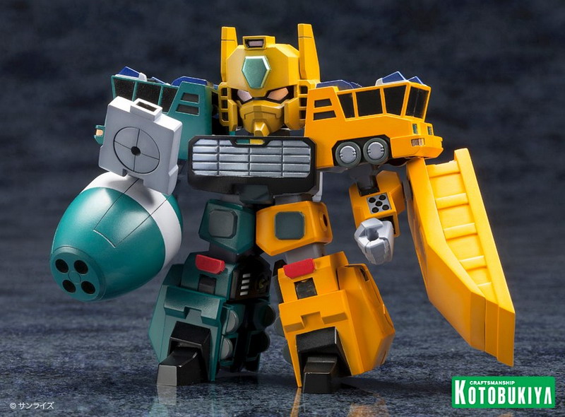 Anyhow, this new Brave King Gao Gai Gar figure - Gekiryujin - is part of Kotobukiya's "D-Style" plastic model kit series, which features various mecha rearranged into stylized miniature versions. Included in the kit are the individual robots FuRyu (transforms into a blue cement mixer) and RaiRyu (yellow dump truck), which join together to form the mighty Gekiryujin, a cute robot standing nearly 4 inches tall with multiple points of articulation. This new set consists of 130 pieces molded in pre-painted plastic featuring the individual color palette of each vehicle and robot. No painting is required and assembly is a snap.
