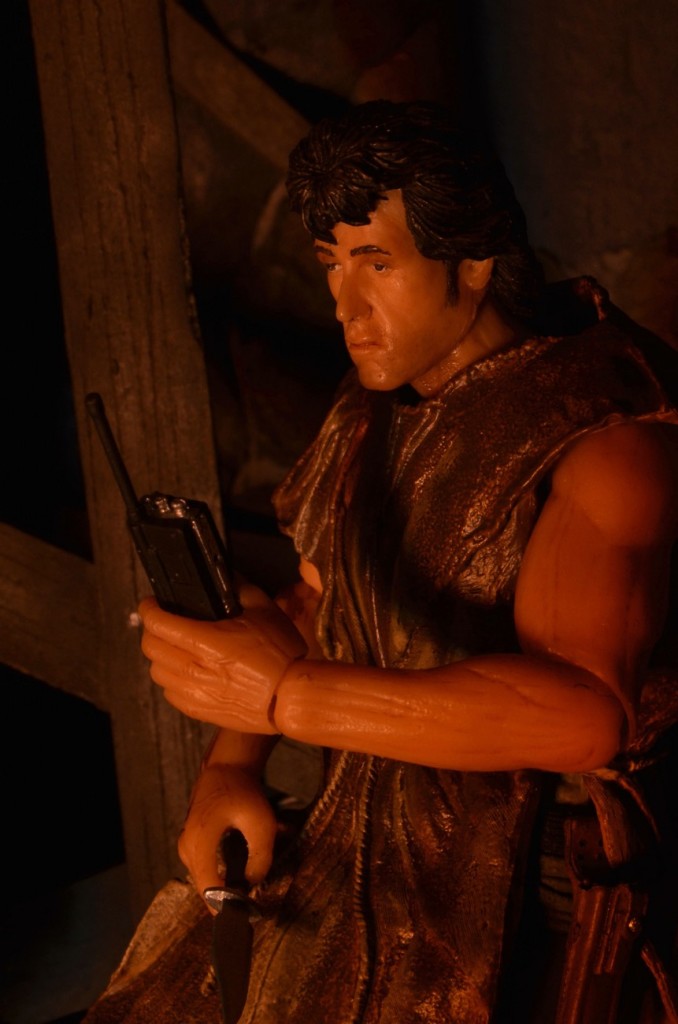Following the release of "First Blood" Rambo (hitting retail now), comes NECA's second 7-inch action figure of Sylvester Stallone: "Survival" Rambo. Pulled from the movie First Blood, this figure is based on one of the key action sequences where Rambo seeks shelter in the wilderness while being pursued by local police. Rambo comes loaded with tons of accessories including survival knife, walkie talkie, pistol, assault rifle, and spear.