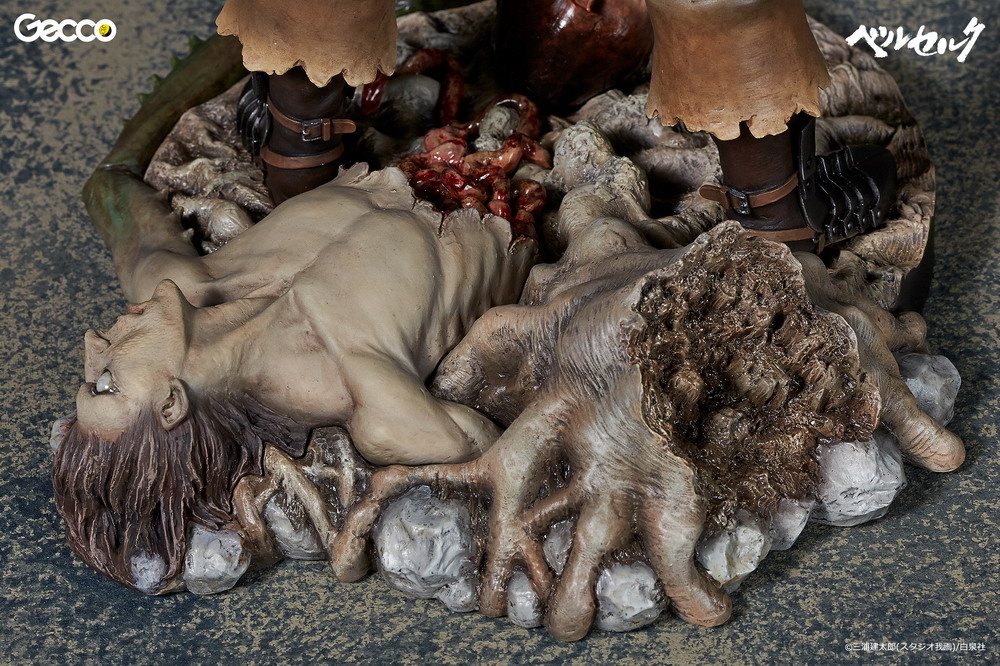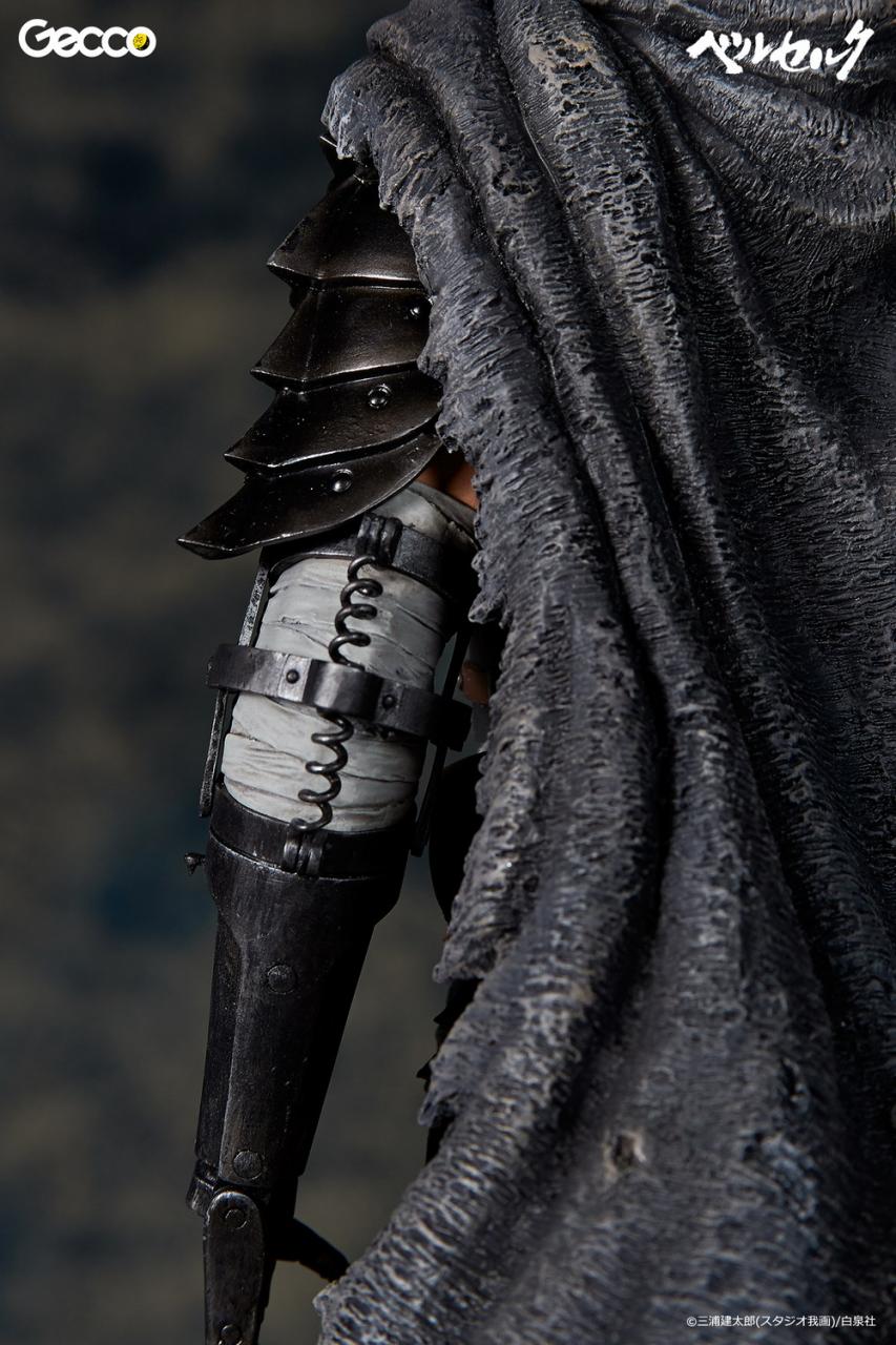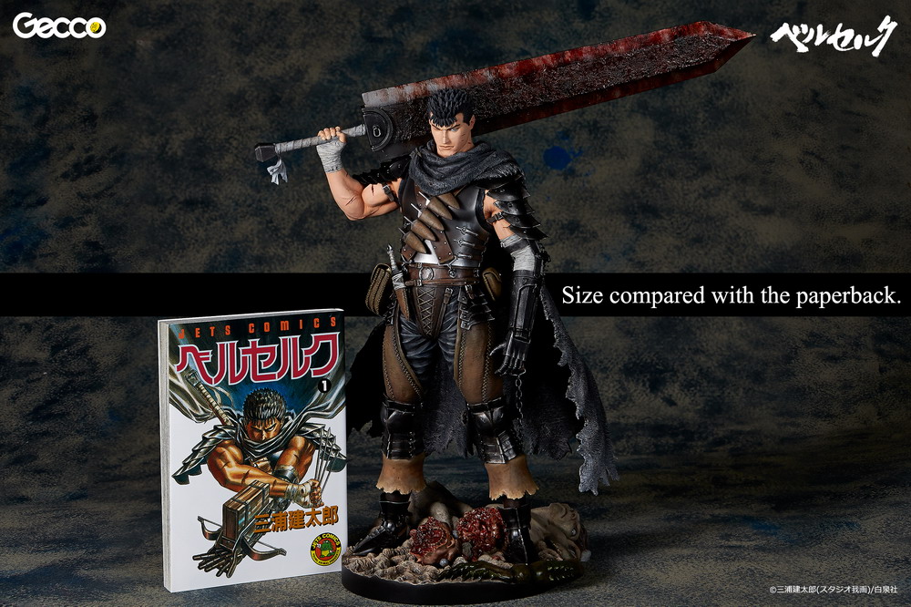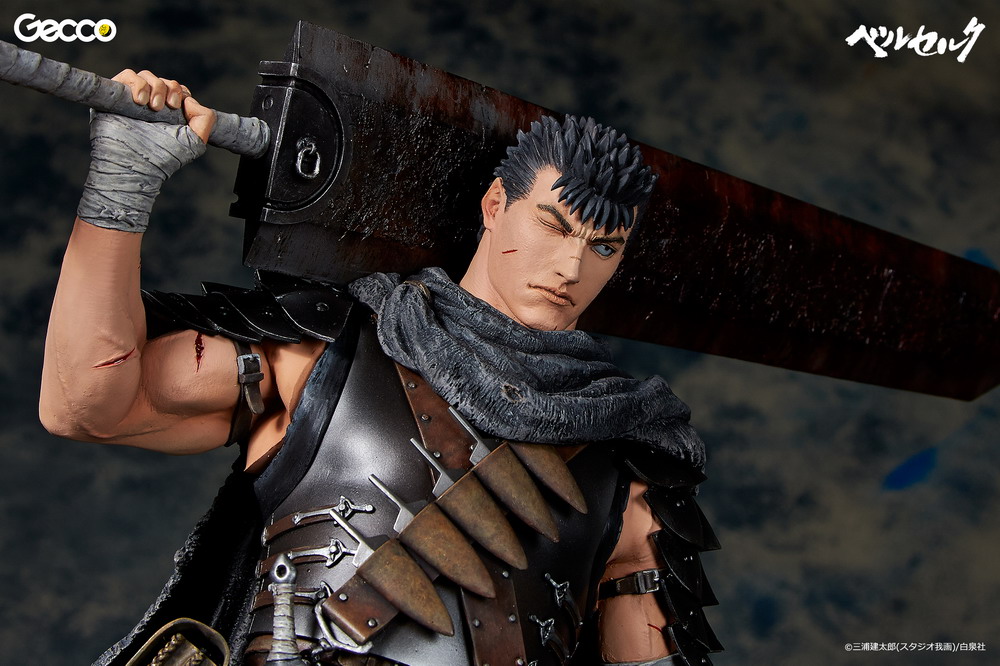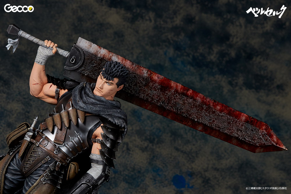 Japanese figure manufacturer Gecco (gecco.co.jp) shares with us their latest release: a 1:6 scale PVC statue of The Black Swordsman, "Guts" from the hit fantasy anime and manga series, Berserk. Measuring approximately 15 inches tall (38cm), the detailed sculpture captures the powerful attitude of the character, Guts' giant sword "Dragonslayerh" resting on his shoulder. His freshly used sword, along with the slain "Apostle Spawn" on the base below, create a tense atmosphere.