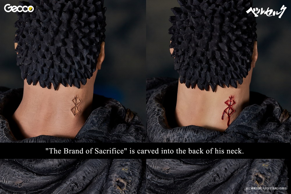 The statue includes two interchangeable head sculpts, capturing both "glaring" and "sneering" portraits. "The Brand of Sacrifice" is carved into the back of his neck.