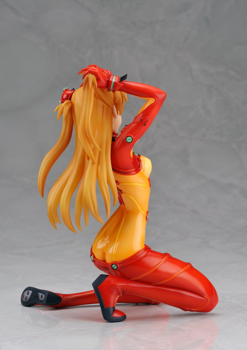 Kneeling with one of her feet tucked under her, the alluring Asuka is posed seductively as she adjusts one of her long pigtails. Her unique red and orange test suit is even more revealing than the regular plug version, and accentuates the girl’s curves with fantastic sculpting. Langley’s trademark red hair is recreated with exquisite attention to detail, and is further accentuated by carefully applied paint applications over translucent plastic. Sculpted by Tsukuru Shirahige, the Eva pilot is approximately 6 inches tall (1/6 scale), and rests on an exclusive clear base.
