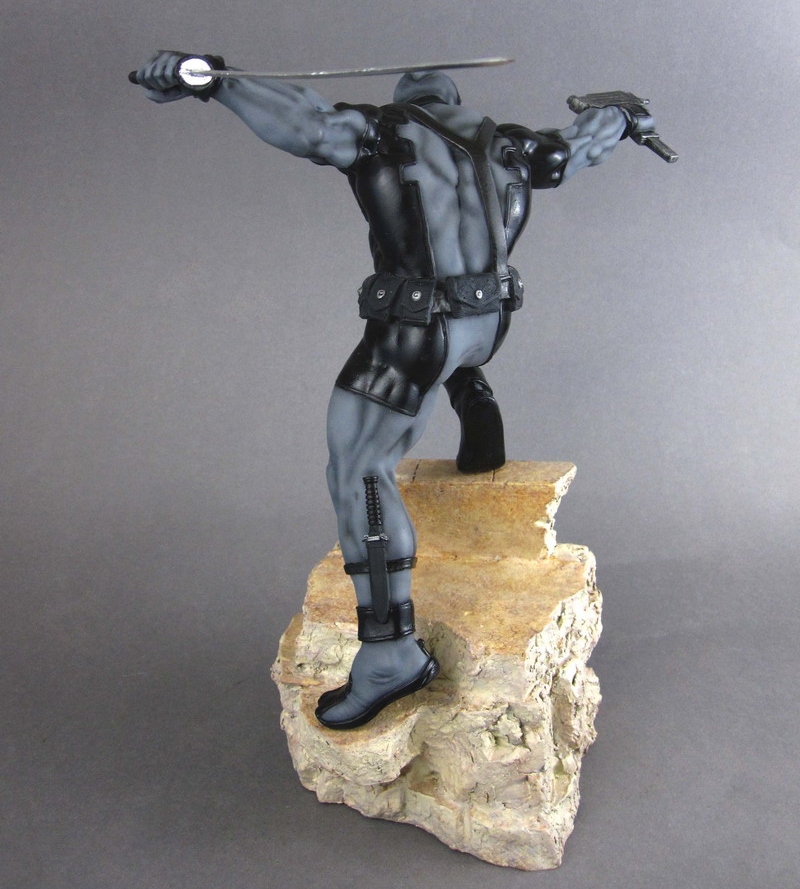 Based on the recently released Deadpool Fine Art Statue (stay tuned for our in-depth review!), the X-Force version really kicks thing up a notch. The mutant hero is posed in the midst of intense action, leaping over a bullet-ridden rooftop with a machine gun and katana at the ready. When working with the clandestine team Wade trades in his iconic red for a black and bluish-gray version of his skintight costume that still bears his usual assortment of goodies including the knife sheathed on his left ankle, various waist pouches, and a gun holstered on his right thigh.