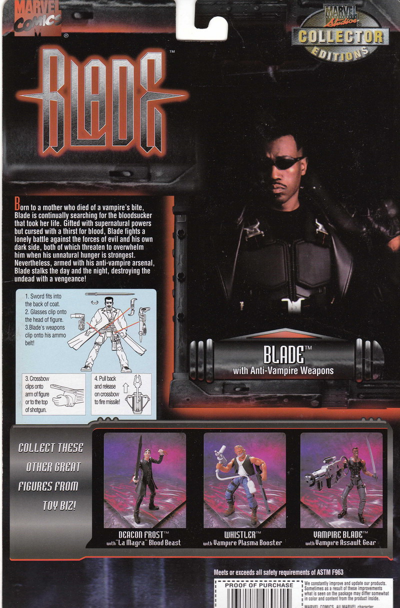 [HR][/HR]I'm pretty sure these Blade action figures were released prior to the movie, but regardless, I know I picked one up before I saw it. And it's a good thing I did. Once word got out about how utterily cool Blade was (my favorite Marvel movie to date), these figures from Toy Biz were suddenly very HOT, and like a slain vampire, quickly vanished from toy store shelves. Toy Biz would re-release the Blade figure later on in their fifth assortment of Marvel Legends, but I've always found the original to be better. For one, the trenchcoat on the first release is of much better material. And while the updated Blade featured more articulation, it was almost too much - the figure's wonky ball-jointed hips and hinged feet working against the sculpt.