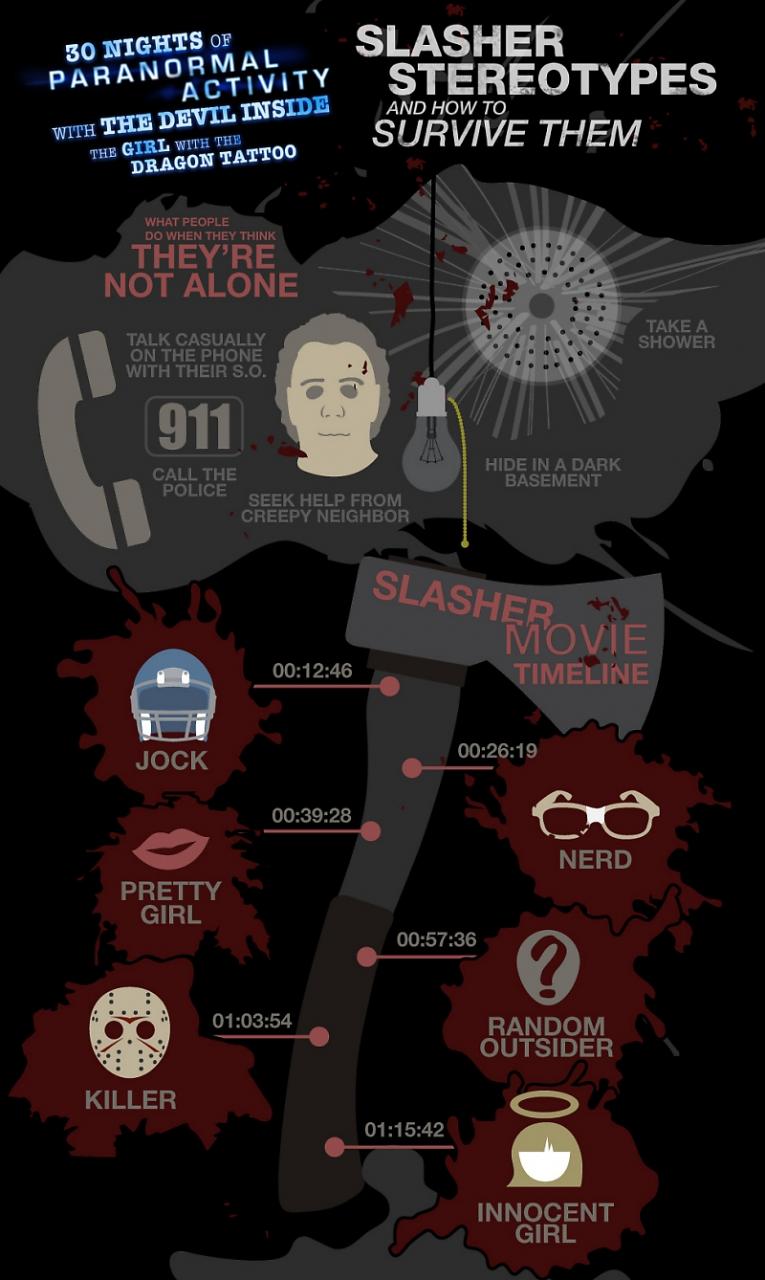 [HR][/HR]A brand new infographic (pictured below) for the upcoming Blu-ray/DVD release of <b>30 Nights of Paranormal Activity With The Devil Inside the Girl with the Dragon Tattoo</b> has been released that focuses on Slasher Stereotypes and How To Survive Them, including a Slasher Movie Timeline and Horror Movie Advice!