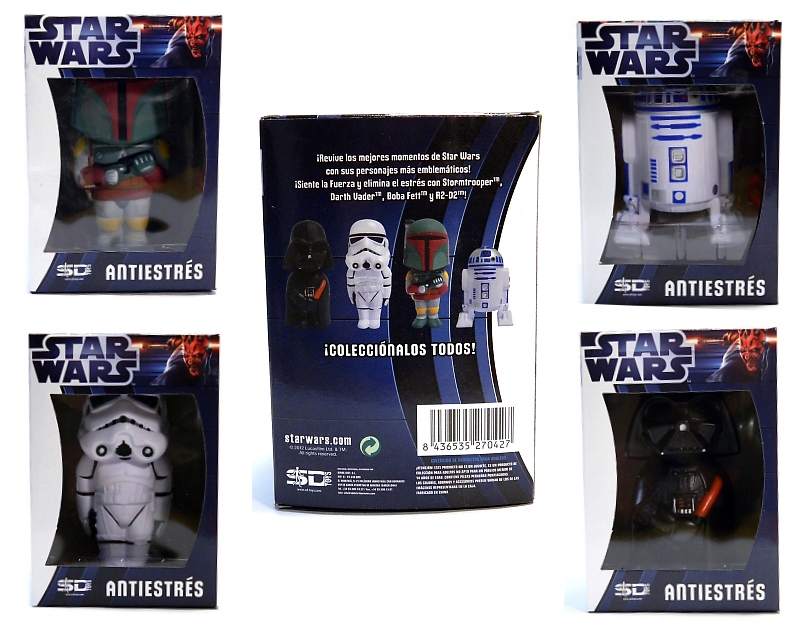 In addition to Star Wars plush, magnets, bookmarks and mugs, SD Toys has introduced Star Wars Stress Dolls to the Spanish market. Retailing at 9.95 EUROS each (approx $13 USD), this collection of soft squeezable Star Wars characters currently includes Saga villain Darth Vader, a Stormtrooper, the adorable astromech R2-D2, and everyone's favorite bounty hunter, Boba Fett. At about 5 1/2 inches tall, each Star Wars Stress Doll fits comfortably in an adult hand. In addition to fan favorite characters to unwind with, SD Toys has plans underway to introduce Star Wars Spaceship Stress Dolls soon. A squishy X-Wing? Count me in.