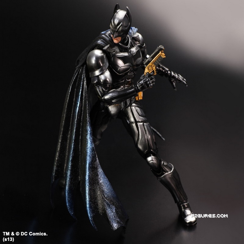 Square Enix reveals their San Diego Comic-Con 2013 exclusive: a Play Arts Kai Batman, re-imagined in a metallic black finish. This 10-inch tall exclusive figure, based on Batman's look in The Dark Knight Rises, is priced at $64.99 and limited to only 1000 pieces created. The figure comes with alternate sets of hands, various weapons, and a display stand.