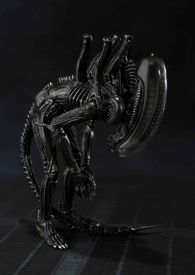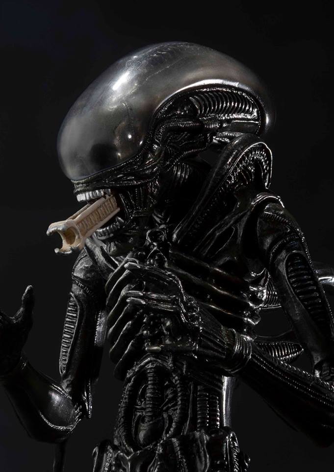 Developed from the ground up to replicate poses from the Alien film the overall style dictated by the long arms and legs of the actor inside the suit, and the finely detailed sculpting of the suit itself as designed by Geiger, are replicated in the product in exquisite detail. Big Chap's distinctive translucent head carapace is rendered with a separately-molded semi-translucent part, allowing the precision-sculpted skull beneath to show through. The bone-like tail is built from 18 individually jointed segments for enhanced detail and the tip employs die-cast metal for enhanced weight and realism. Figure set also features interchangeable hand parts and special display stand.