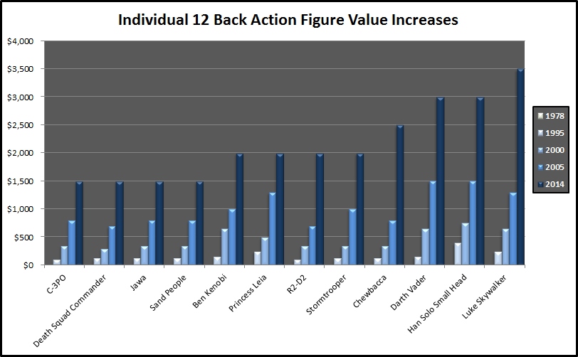 The chart above illustrates the rise in value of the original “Brian’s Toys 12 Back Set Index” to reflect the retail value of the original 12 Star Wars action figures for toys in near mint to mint condition.