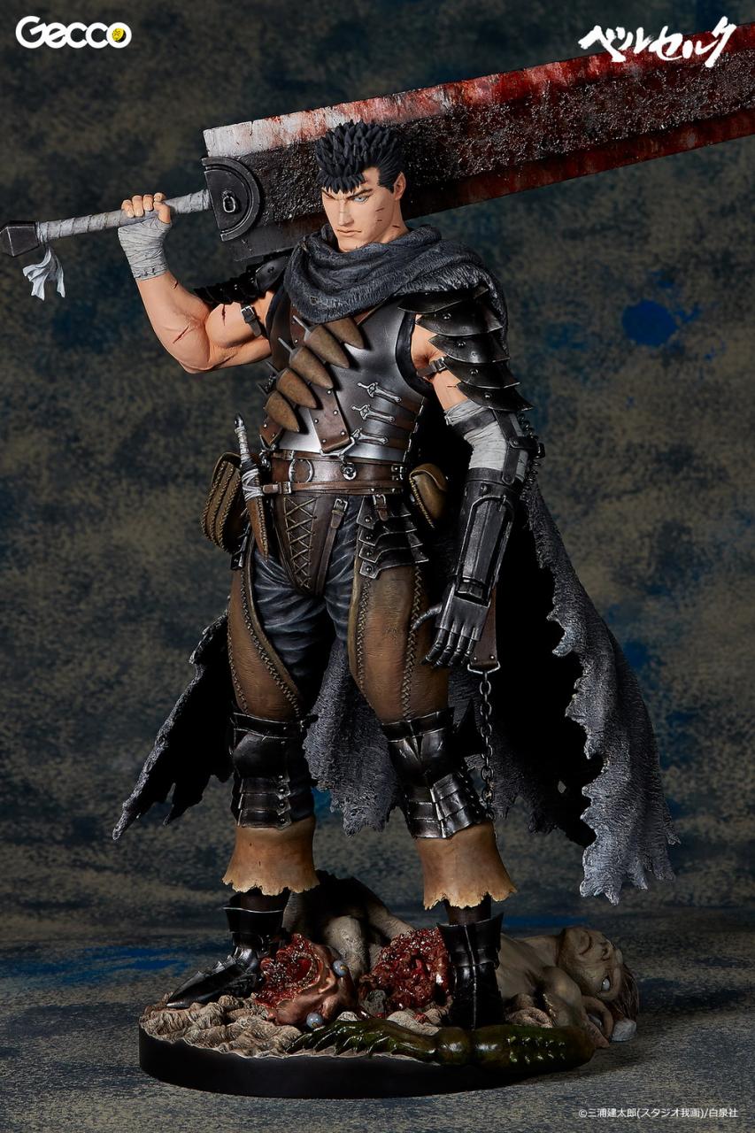 Japanese figure manufacturer Gecco (gecco.co.jp) shares with us their latest release: a 1:6 scale PVC statue of The Black Swordsman, "Guts" from the hit fantasy anime and manga series, Berserk. Measuring approximately 15 inches tall (38cm), the detailed sculpture captures the powerful attitude of the character, Guts' giant sword "Dragonslayerh" resting on his shoulder. His freshly used sword, along with the slain "Apostle Spawn" on the base below, create a tense atmosphere.