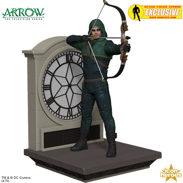 Based on the hit CW television series, the Arrow bookend depicts the famed archer standing on a clock tower base... this Action Figure Xpress exclusive featuring Season One eye shade and bow! This Arrow bookend stands approximately 9 inches tall and is made of high quality polystone, making a perfect display while holding up your favorite books, games, movies, and more.