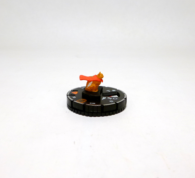Streaky’s debut in HeroClix comes courtesy of the feline sculpt that appears twice in the main World’s Finest set for both the generic Black Cat and the familiar of Klarion the Witch Boy named Teekl. The base sculpt is a diminutive kitty that’s deceptively straightforward, but any cat lover/owner will immediately recognize the hunched sitting pose and if you look closely you can see fur details, a tail wrapped around the left side of its paws, as well as a cute little face. And while the generic is, of course, black and Teekl is brown with pale spots on the face and feet, Streaky is an orange kitty with intense yellow eyes and the character’s trademark white lightning bolts on either side of its body. Even better, the super cat adds to the base sculpt with a flowing red cape tied around its neck complete with the “S” shield in yellow!