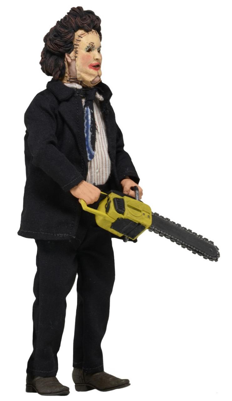 NECA is releasing a brand new retro-cloth version of Leatherface, this time the Texas Chainsaw Massacre killer in his dinner attire from the original 1974 film. The poseable 8” figure is dressed in tailored fabric clothing similar to the toy lines that helped define the licensed action figure market in the 1970s. For the special occasion, Leatherface wears a dinner jacket, shirt and pants, and a newly sculpted, “Pretty Woman” version of his mask. He comes complete with chainsaw accessory.