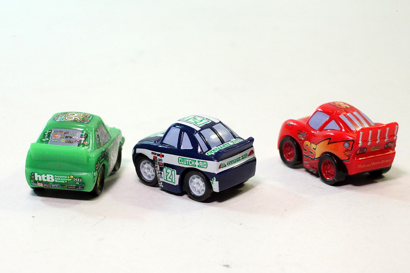 Each 3-pack of the Micro Drifters contain a different set of cars that are visible to the buyer, making collecting the characters you want that much easier. The set we’re looking at comes with Lightning McQueen, Chick Hicks, and Clutch Aid no. 121. The “Roll Me” feature allows you to spin the package around, sending one car in a loop, just so you can get an idea of what you’re buying before you commit. It’s a clever and interactive feature.