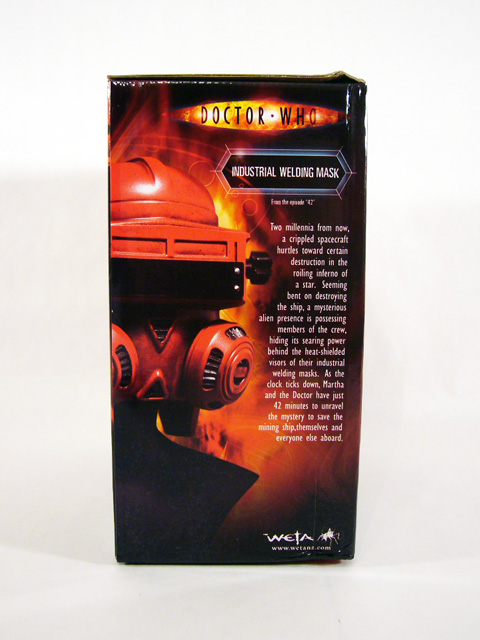 Weta’s miniature replica of the helmet comes to you in a very sleek box. Photos of the replica Welding Mask really pop over the black background and swirling red and yellow Doctor Who timestream patterns. The front panel is simple and sophisticated with a full frontal view of the helmet, its name in the bottom left corner, and logos for the show and Weta. One side panel shows the Mask’s profile, while the other has a close-up shot along with a description of the episode. The back of the box has an extreme close-up photo and rearview shot with a history of Doctor Who.