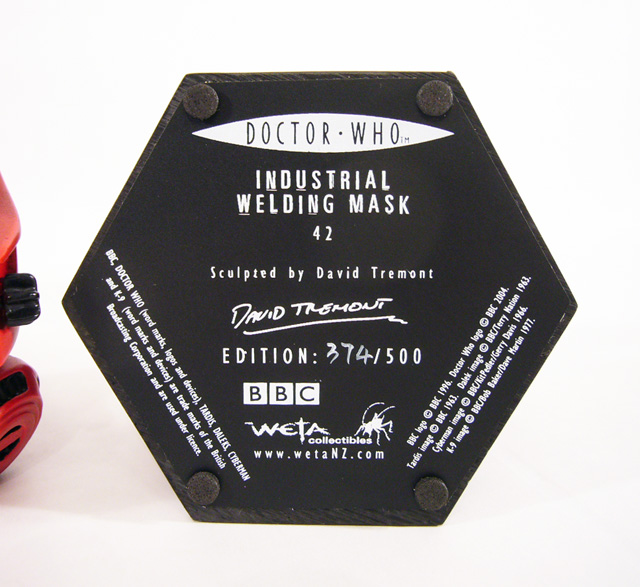 Weta’s miniature Industrial Welding Mask is a fantastic looking prop replica. Just taking it out of the box you can tell how much care and attention went into it. First off, it’s incredibly heavy for its size. At only three inches tall the cast metal mask by itself weighs nearly two pounds! Just like with Weta’s other miniature helmet lines (Lords of the Rings, etc.) the Doctor Who products come with model busts on which to mount them. The stand is about 6 ½ inches tall, a simple male head and torso made of black polystone on a hexagonal base. The bottom of the base has a bunch of information, a signature by sculptor David Tremont, and its individual number (out of 500). The mask fits snugly on the bust, and there’s built in padding so the top of the head doesn’t get scratched.