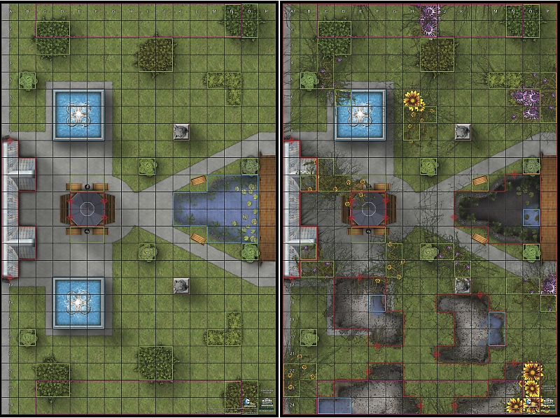 Since this is No Man’s Land every match has a chance for a seismic event; a result of 3 or less on 2d6 rolled at the end of each player’s turn means you flip the map to reveal Robinson Park: Post-Cataclysm! While the park has suffered some damage, namely the sinking of the pond and four holes in rows 17-24, it has also been wholly taken over by Poison Ivy with huge plants everywhere! That means more hindering terrain and blocking, and it’s all in a much more haphazard manner than on the pre-earthquake side. Players who get dropped onto this side mid-game will have an interesting time adjusting to the massive changes, especially those with no flying characters. Watch out for all of the elevation changes as well, with the newly opened holes at #1, the ground level at #2, and the rooftops now at #3.