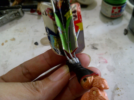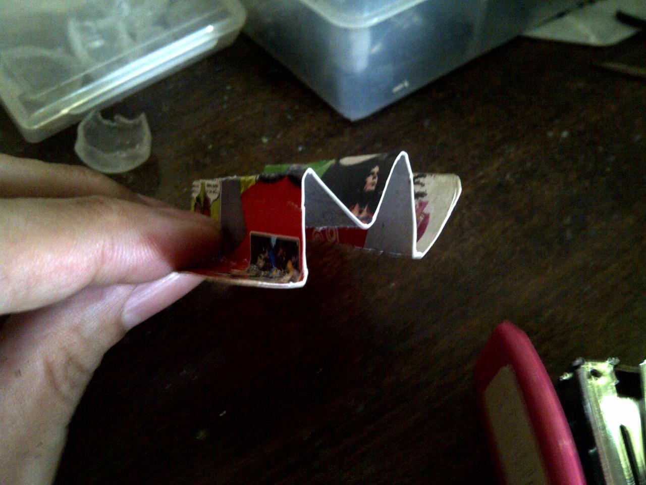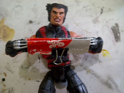 I made a simple kit specially for wolvie's claws from thick paper & paper clip. Just fold the thick paper into "M" shape. If you have a blow dryer near by, heat Wolvie's claws for a minute to make them softer. put the claws into the folded paper, Clip it & wait for awhile.