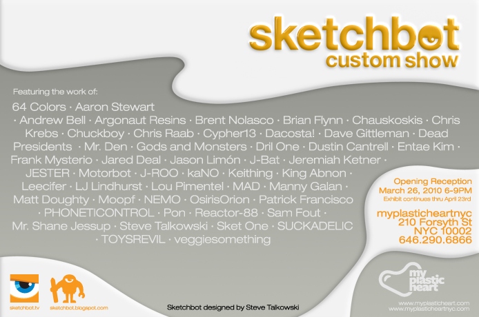 [HR][/HR]Myplasticheart presents the the Sketchbot Custom Show, the official launch of the new figure by NYC animator Steve Talkowski. 50 artists and designers will have their hand in creating original designs for the Sketchbot platform.