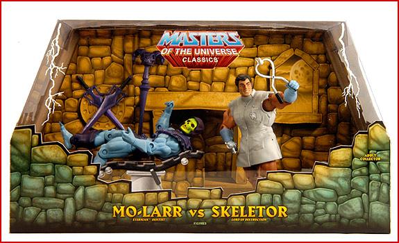 Mo-Larr was featured in the famous (infamous?) episode featured on the DVD release of Robot Chicken Season 2 where he chased down Skeletor and relieved him of an impacted wisdom tooth, sans numbing agent. Skeletor features a new head with missing tooth, Havok Staff, Power Sword, and Half Power Sword. Mo-Larr, Eternian Dentist, comes with five assorted dental tools, including drill and floss.