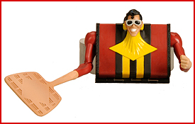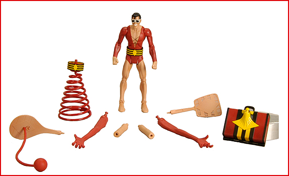 DCU Plastic Man has interchangeable standard arms, stretchy arms, giant form hands (a fly swatter and a bouncy ball with racket), and interchangeable stretchy neck and leg springs.