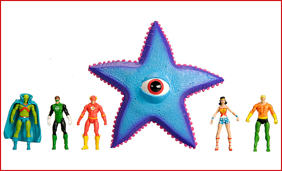 This special pack commemorates the 75th anniversary of DC Comics. The Starro pack re-creates one of the most famous DC covers of all time, the cover of Brave and the Bold Issue #28, the first appearance of the Justice League and Starro the Conqueror. Comes with all five JLA members featured on the cover as articulated figures in the same scale as Infinite Heroes. Includes Martian Manhunter, The Flash with added articulation, Wonder Woman (all new), Green Lantern (with construct), Aquaman (all new), and giant, bendy Starro. Box features lights and sounds with the voice of Kevin Conroy, TV's animated Batman, describing the characters and events seen on the cover.