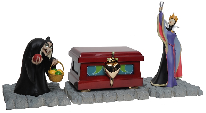 The Heart Box is constructed from solid rosewood and features a 24-karat gold-plated heart that locks with a dagger-lock mechanism. It sits on a museum-quality display base that features two sculptures by artist David Kracov: One depicts the Evil Queen holding the chalice that contains a magical elixir to turn her into the "Old Hag" – who, in the second, holds the fateful "magic wishing apple." Each Heart Box includes a numbered plaque and certificate of authenticity, and production will not exceed 500 pieces worldwide.