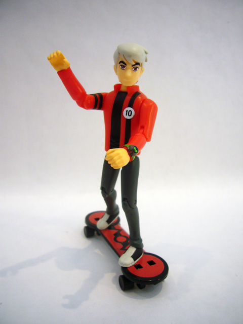 Albedo has pretty standard action figure articulation with joints at the neck, shoulders, elbows, hips, and knees. That's actually pretty good for Ben 10 figures, and certainly enough for basic posing. Albedo also comes with an accessory, a red painted hover board. Like Ben's original one in green, the board has a post that plugs into the figure’s foot and wheels for zooming around!