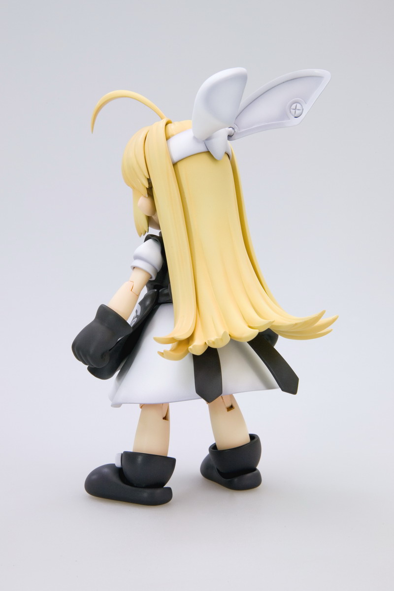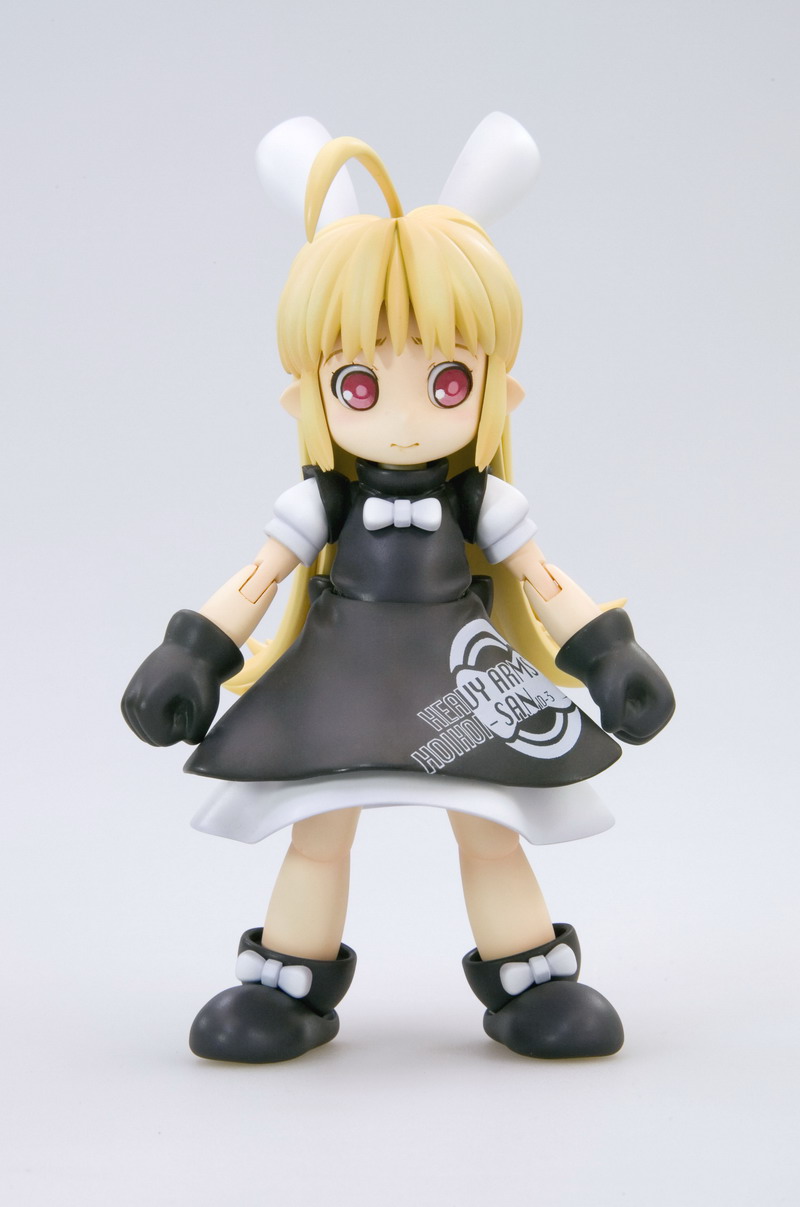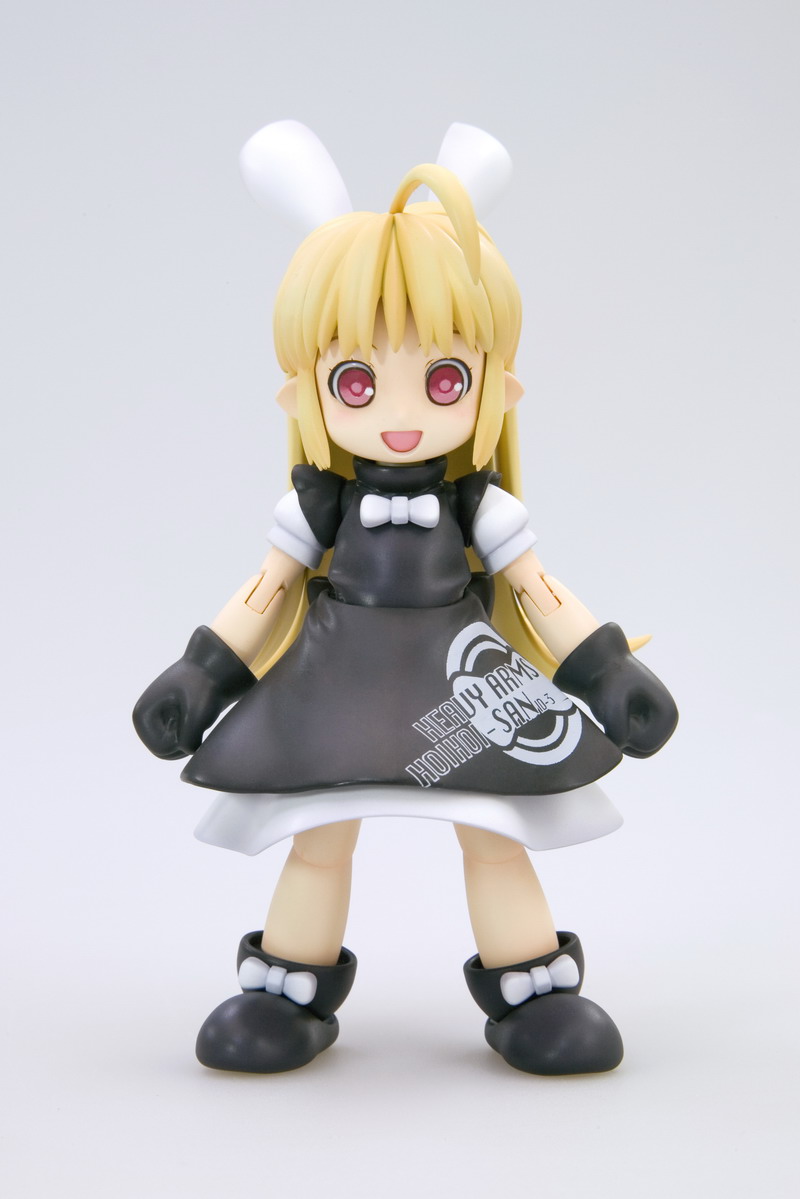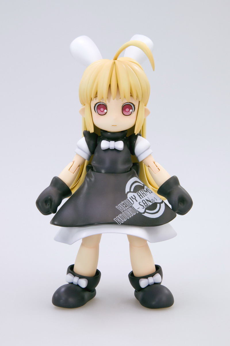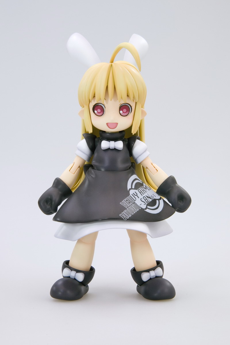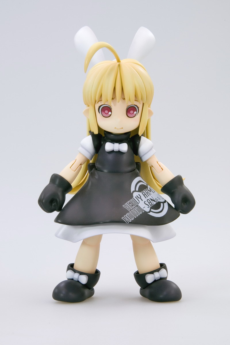 Like the previous "Heavy Arms" version (see HERE), this Hoi Hoi-san wears her traditional maid's outfit with matching slippers and bunny ears, but this time it's in the "Nightmare" black and white color scheme with pink and red eye decals. The bug killer comes with two different faces – one happy and one angry for furious combat and her accessories include the massive Hoi Hoi Hammer, heavy machine gun, and "Bug Killer" bottle. Sculpted by Misono Auto, Masatoshi Aoki, and Yuta Itoyama, Hoi Hoi-san is comprised of approximately 130 pieces, and can be painted in any way you'd like. The little robot has 25 points of articulation for posing, and she comes with special decals for her eyes and the logo on her skirt. And if that wasn't enough, the Nightmare version even comes with an exclusive poster.