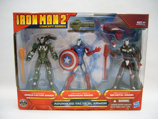[HR][/HR]With Iron Man 2 on movie screens now and toys from the film everywhere, it came as no surprise that Hasbro would further capitalize on the enormous success by releasing "variant armors" (read: repaints) to the fans. Going one step beyond the already cool 3 3/4 inch Concept Series of Iron Man 2 figures, the latest release is a Kmart exclusive three pack containing new versions of existing figures called Advanced Tactical Armor with Omega Factor Armor War Machine, Vibranium Armor Iron Man Mark VI, and Bio-Metal Armor Iron Man Mark V. Are the "Concepts" better than the originals? Is this set worth tracking down? Let's take a look!