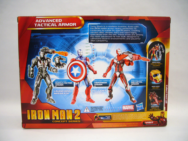 The back of the box has a brief explanation of these armors as further tinkerings by Stark, along with photographs of each one. There's also the expected upsells, in this case Iron Man Collection 1 Figures, Iron Man Helmet, and Iron Man Mark VI Red Vortex car toy.