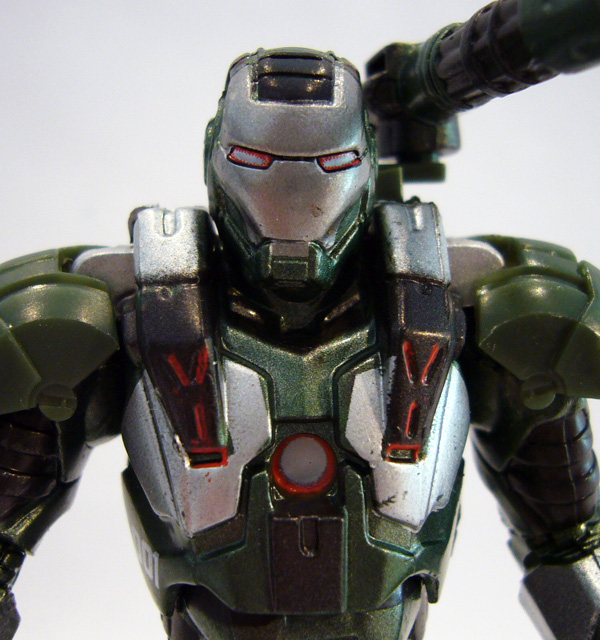 I won't go over every detail again, but instead focus on what's new. Instead of Rhodes' standard black and silver paint scheme, the Omega Factor looks army-ready in drab green, black, and silver (the latter colors reversed from War Machine). While the previous figure had only blue accents on the eyes, the new one has quite a bit of painted details with orange on the eyes, chest, and upper legs along with yellow and black warning patches on the forearm machine guns. Overall the paint is much more "clean" and new looking than on the regular War Machine, which would make this a great candidate for army builder status.