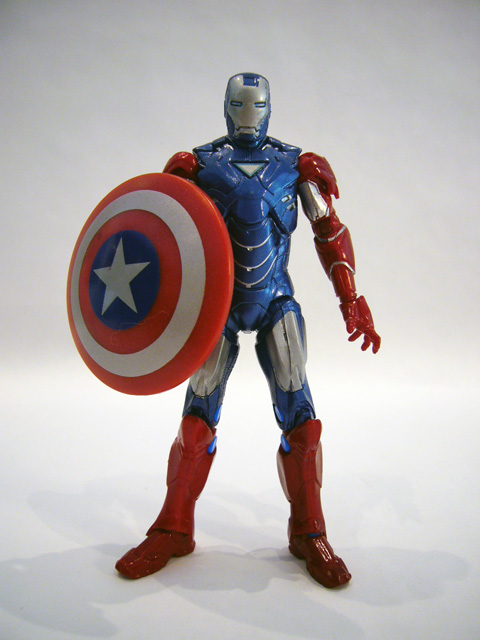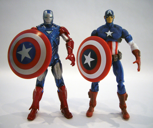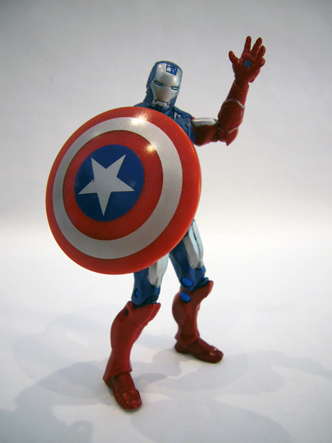 Vibranium Iron Man trades in his heavy weaponry (the original figure came with an oversized projectile-firing missile launcher) for something a bit different. Taking his cue from Captain America, Stark has duplicated the patriot's shield. In fact, the accessory is the same one that came with the Marvel Universe Cap figure, repainted in darker colors to match Iron Man. It even has the forearm clip and dual elastic straps so Iron Man can carry it on his arm or his back. It's a great accessory, and for older collectors it's much preferred compared to those silly missile launchers.