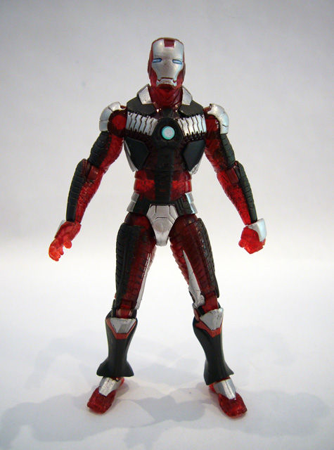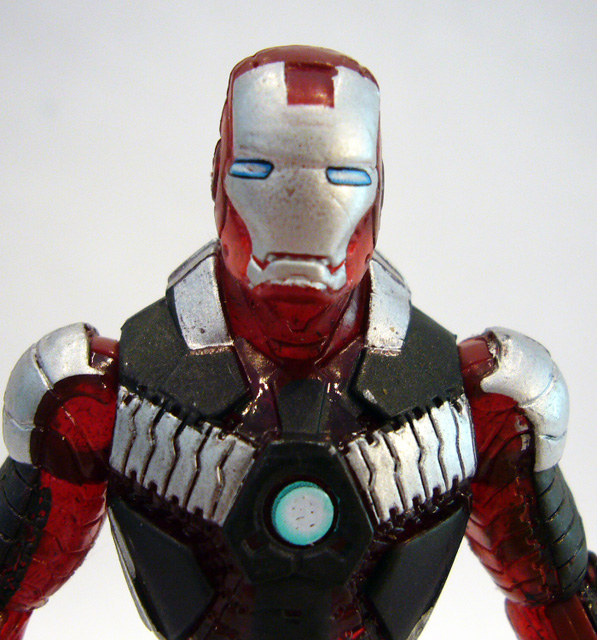 The final figure in the three pack didn't excite me so much on first glance. Bio-Metal Armor is a redeco of the Iron Man Mark V figure. The "Suitcase Armor" is very slim and small, representing the basic armor suit Stark can carry around with him for emergencies, and the original's bright red and silver didn't do it for me. But, I have to admit that Bio-Metal has changed my mind. The figure is made up of dark red translucent plastic, with significant painted details on top of that. There are black panels and segments on the figure's torso and limbs, with toned down silver decorations. Pale blue shows up on the armor's arc reactor and the eyes of his faceplate. In person, this color scheme looks really good, especially with just a hint of light filtering through the dark translucent plastic.