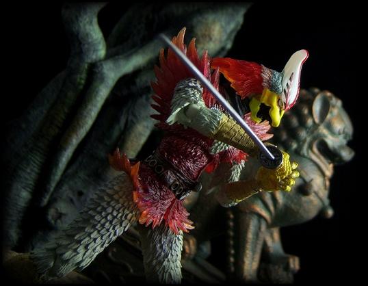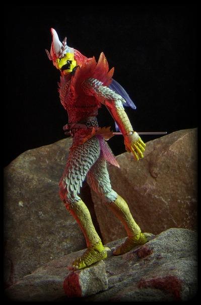 Originally created by sculptors Takayuki Takeya and Kenji Ando, the SIC line features some of the most impressive sculpting of any toy line anywhere. Takeya, one of my personal favorite 3-D artists, brings to life this Japanese spirit ninja beautifully with a generous amount of minute detail, including a variety of feathers covering the warrior's body.