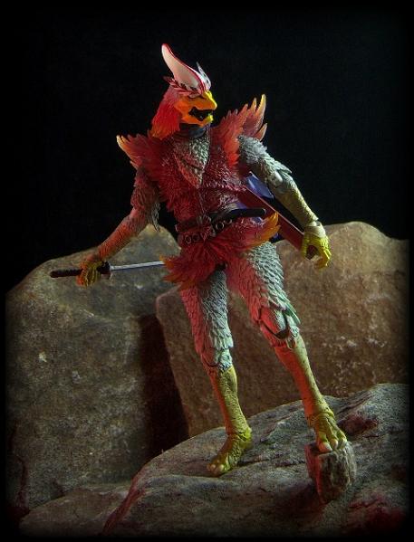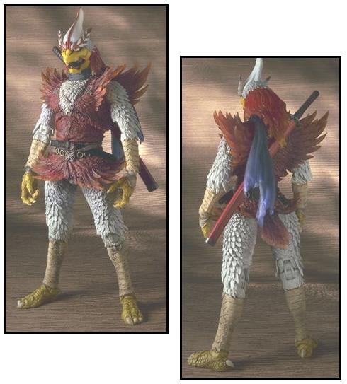 As previously mentioned, the warriors looks (somewhat) like a sword-wielding chicken on acid and these colors are just more proof that wherever Henshin Ninja Arashi is present, there's truly a storm a comin'! His flame-red chest feathers are framed by his snow-white leg and arm feathers. Likewise, his yellow beak, arms and legs again give a balanced feel to the overall look of the figure.