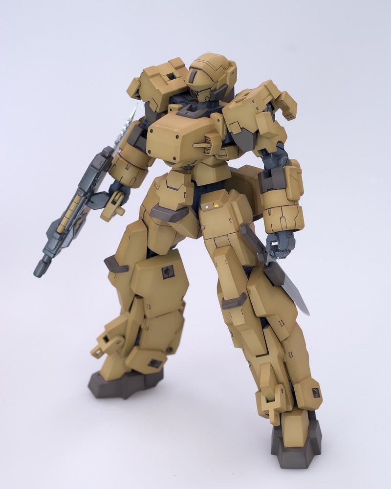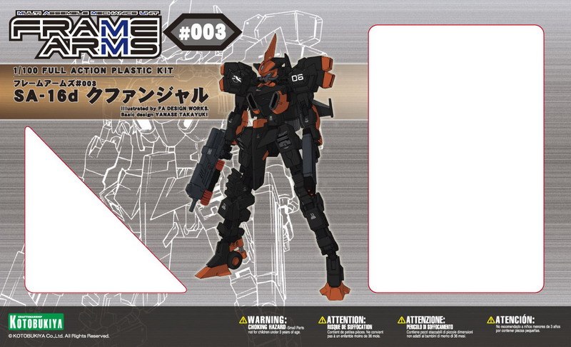 The next robot in the Frame Arms series is the SA-16D KHANJA (pictured above), an advanced version of the SA-16 Stylet that takes the aerial combat attacker to a whole new level. The Khanja is comprised of approximately 180 parts, with 30 points of articulation. The robot stands almost 7 inches tall and comes with its own unique armor and upgraded weaponry including the MSG/MW-04 "Machine Gun and Missile Launcher," FA/MG-04 "Medium Machine Gun," and the FA/ML-04 "Multi Missile Launcher".