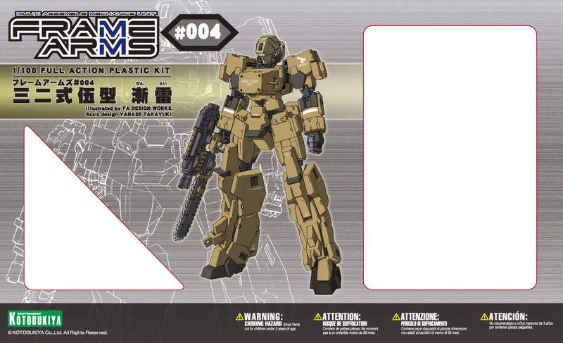 [HR][/HR]Continuing their new line of original robot model kits, Kotobukiya's Frame Arms series has two new members. These never-before-seen robots are based on a core concept: every unit has a basic robot skeleton, or "Frame," which is articulated and covered in universal 3mm attachment points. Incredible armor pieces and weapons differentiate each robot, while all parts are fully interchangeable between all units. The Frame Arms multi assemble mechanical units are even compatible with Koto's M.S.G. (Modeling Support Goods) series of support units and Border Break robots, opening up a huge amount of easy customization.