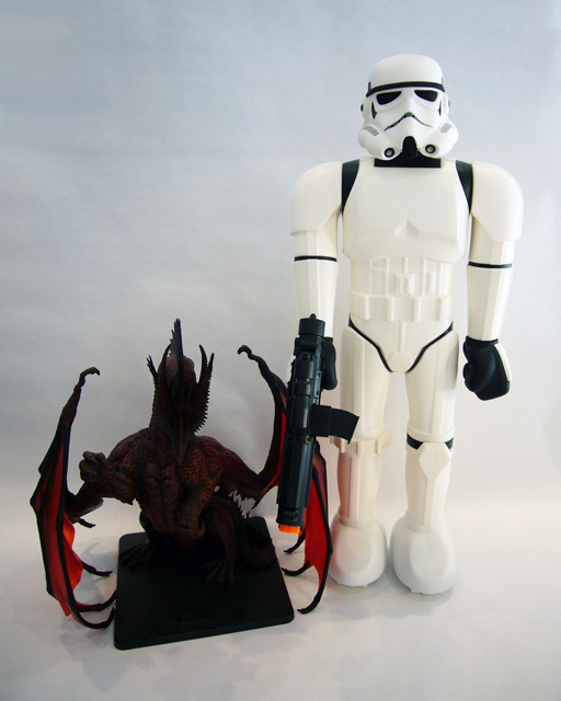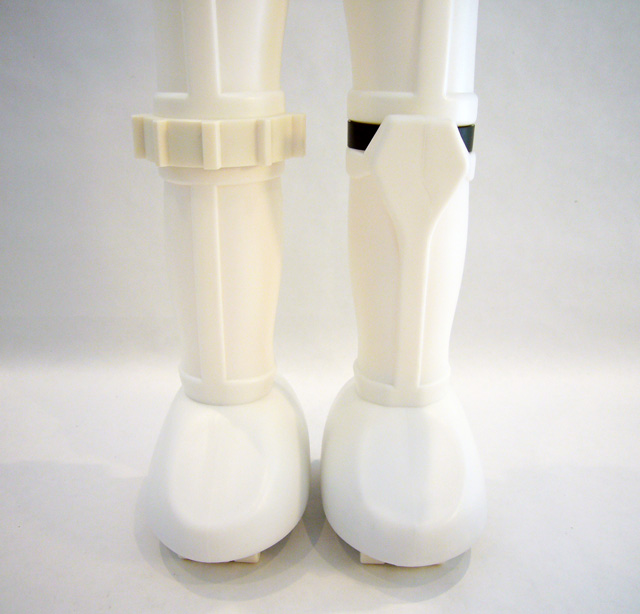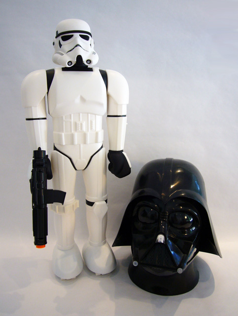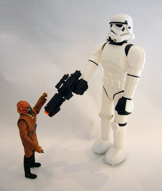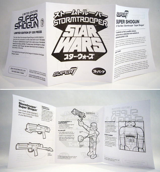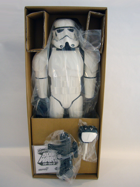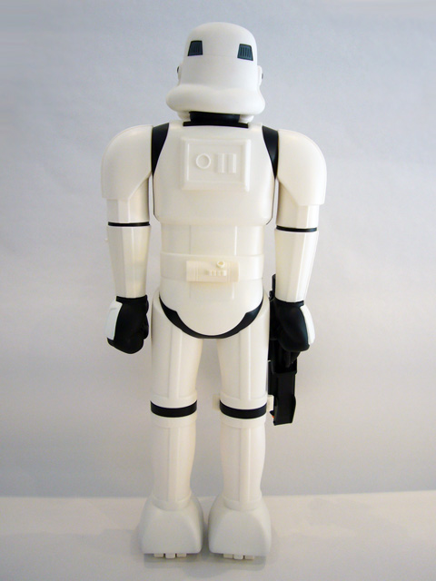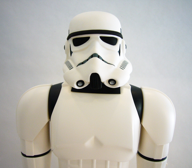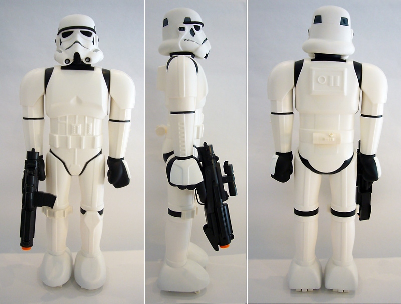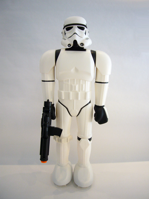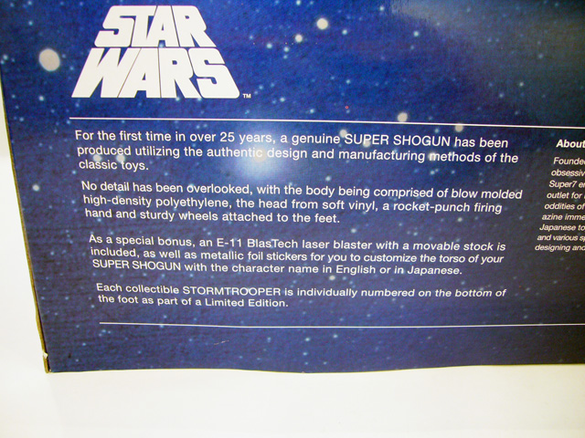 The Super Shogun Stormtrooper is quite a thing to behold. Clocking in at a whopping 24 inches tall this guy makes even 12 inch figures look puny (see the pic of him menacing poor "little" Plo Koon). It's got all of the requisite things to make it a true Jumbo Machinder: its body is made of blow molded high-density polyethylene, the head is vinyl, one fist has firing rocket-punch action, and there are wheels on the bottom of his feet. Put all of that together with the classic Stormtrooper design and a '70s Japanese robot style and you've got the Super Shogun.