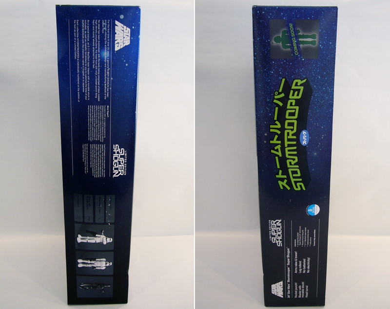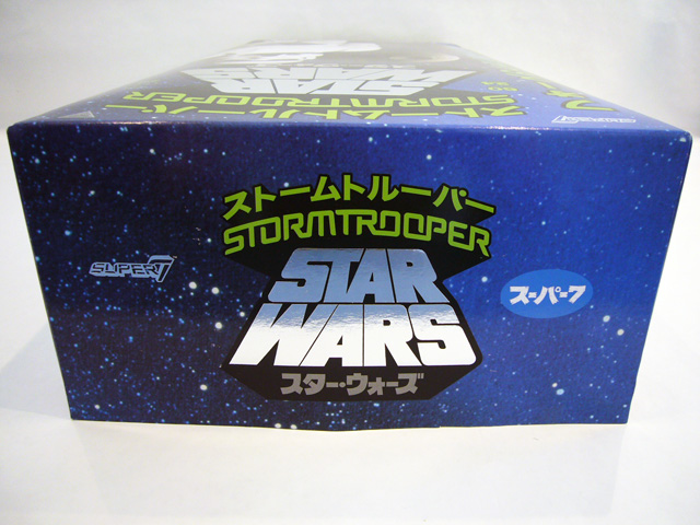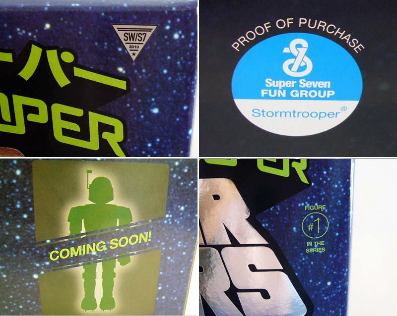 The inner Stormtrooper box is quite a work of art. With design cues taken from the original Jumbo Machinder packaging, this one is dominated by a deep blue star field. The front panel has a huge photo of the Stormtrooper (with the Death Star lurking behind him!), along with stylized graphics and logos in both English and Japanese. The reflective foil Star Wars logo looks great, and the green/blue color scheme is pretty striking. There are tons of little details here and there, like the "SW/S7" license sticker in the corner and a note proclaiming this "Figure #1 in the Series."
