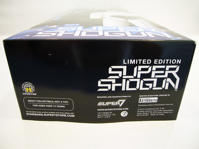 With the huge size of the box, Super7 was given plenty of opportunity to put content on it. Just check out the sides! One side has a description of the Stormtrooper’s connection to the "Super Shogun" world along with a history of Super7 and a note from its founder Brian Flynn. Next to all of that text are some detail pictures and a list of features with fun icons like a no batteries symbol, etc. The other side of the box reprints the Stormtrooper logo with a rundown of the contents and features to the left and a sneak peek at the next figure in the series on the right (I'll give you a hint. It's the most famous sci-fi bounty hunter of all time...). Look closely to find the Proof of Purchase: "Super Seven Fun Group Stormtrooper." With all of that cool stuff you may have a strong urge to display the box. It's a good thing then that the top simply slides off so you can take out the figure without damaging the packaging!