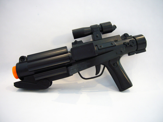 The trooper's left fist is fired via a small trigger button disguised on the left arm. Thanks to a long, heavy-duty spring, the rocket fires really far! Finally, the Stormtrooper comes with a blaster that fits in his posed right hand. It's got a great sculpt with a ton of details, and even a moveable stock! Unfortunately it does have a big orange plug, but that's modern safety laws for you.