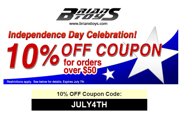 BriansToys.com is celebrating Independence Day by offering a 10% OFF Coupon for all orders over $50! This is for a limited time only, so place your order now before it's too late at www.brianstoys.com.