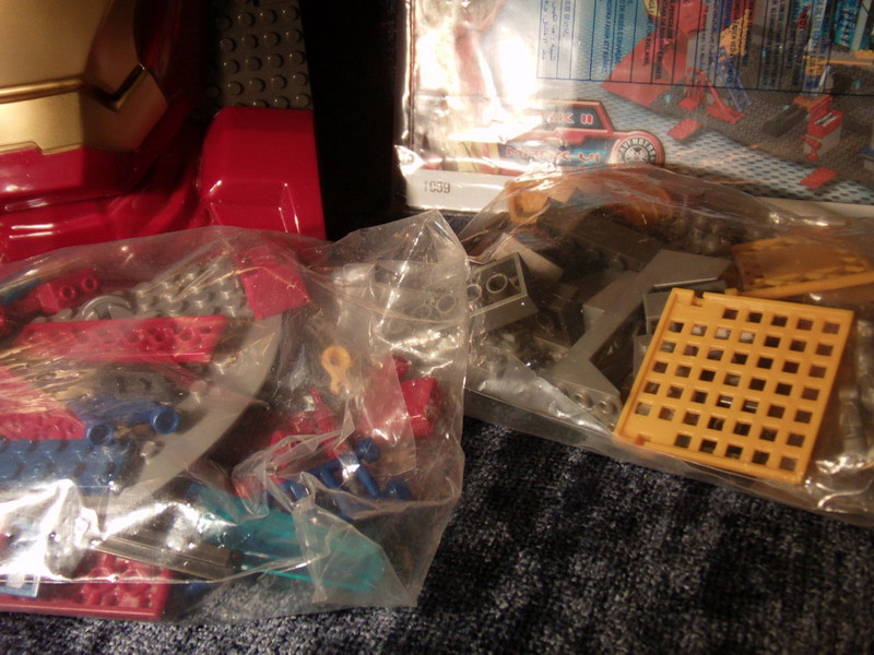 The box is made with a metallic sheen that invokes the metallic nature of the Iron Man armor. The plastic bust and large baseplate are visible on the outside of the box, and tucked inside are three plastic bags. The first bag contains the instruction book and sticker sheet while the other two bags contain the remainder of the blocks. The tiniest pieces are bagged within the bags to help keep them from getting completely lost while building the playset.