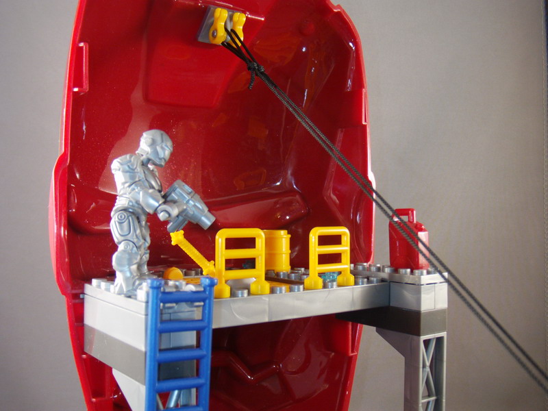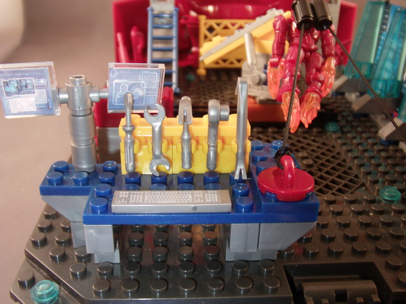 There are many moving parts in the playset that allow it to be an interactive experience. First of all, a working trapdoor is in the second floor area, operated by an easy to use lever. Secondly, the JARVIS computer arm slides, rotates, and swivels, allowing for a wide array of movement. And finally, a flying mechanism using two pieces of string allow for the figures to simulate flying from the first to the second floor. There is an additional harness that can connect to an object like a doorknob and allow for flight outside of the playset, extending the playtime possibilities of the set.