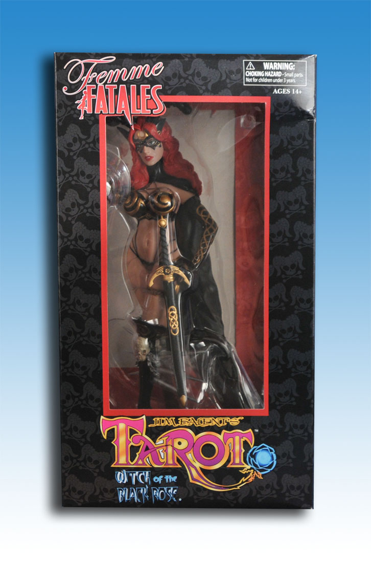 [HR][/HR]Diamond Select Toys provides a packaged look at their second Femme Fatales release: Tarot, the Witch of the Black Rose. Pictured is the standard release in black (above) and the San Diego Comic-Con exclusive version in white (below). The regular version is priced at a SRP of $34.99 and the exclusive version is priced at $39.99 with a limited run of 750 pieces. Inquire about Con availability at the Diamond Previews booth #2401.