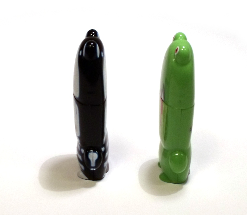 What's also neat is when you insert a Mimobot, the USB drive on your computer reads as the character's name. Kind of cool to see "Isadore" listed as my E: drive as opposed to a generic term like "USB Flash Drive". I should mention here that using these is literally a snap: Simply pop off the Mimobots head (sounds horrible, doesn't it?) and insert the device in a spare USB port. Every computer has one these days and the Mimobots work on both PC and Mac. When inserted, a light on the character's "butt" glows when in use. When not in use, the head pop backs on with a solid "click," insuring it won't be slidding off anytime soon. These are very well made, durable flash drives.