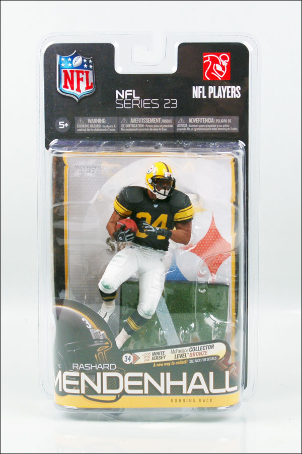 [HR][/HR]McFarlane Toys and William Davis Collectibles are teaming up again to bring NFL fans an exclusive figure of Pittsburgh Steelers running back Rashard Mendenhall. Pittsburgh's starting running back is part of McFarlane's NFL 23 series in the Steelers' black jersey, with a white jersey version as a Collector Level figure - but this exclusive version features Mendenhall in Pittsburgh's popular retro uniform - complete with white pants and a yellow helmet.