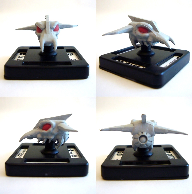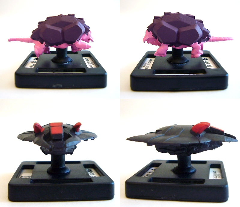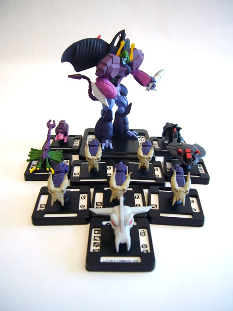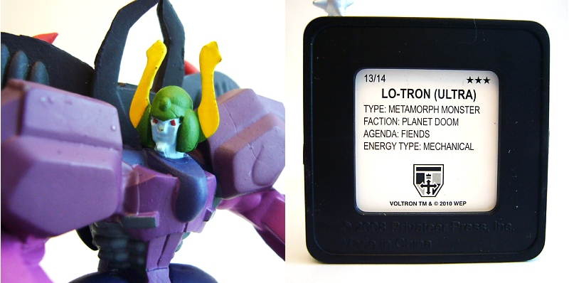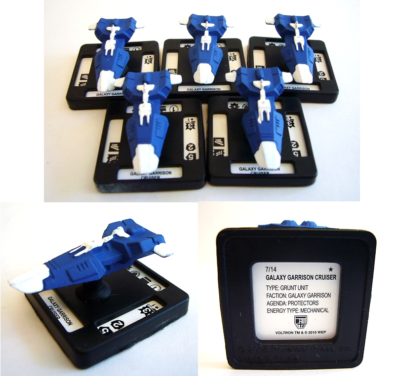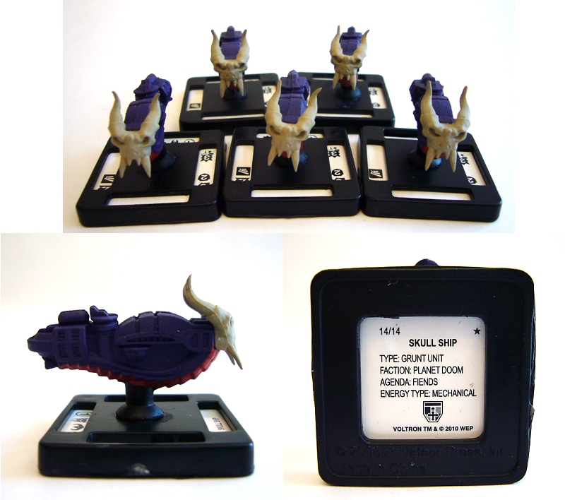 The heroic Galaxy Alliance is represented by Voltron, the five Voltron Lion figures (black, red, green, blue, and yellow), and five Galaxy Garrison Cruiser units. On the opposite side of the field of battle is the Drule Empire with Lo-Tron, four robeasts, Lotor's Command Ship, and five Skull Ships. Each figure besides Voltron and Lo-Tron are about an inch and a quarter long or tall and come mounted on square bases that correspond to the spaces on the battle mat. The larger figures are about three inches tall on bases that cover four map squares. Flip over any figure to see additional interesting info on the bottom of its base!